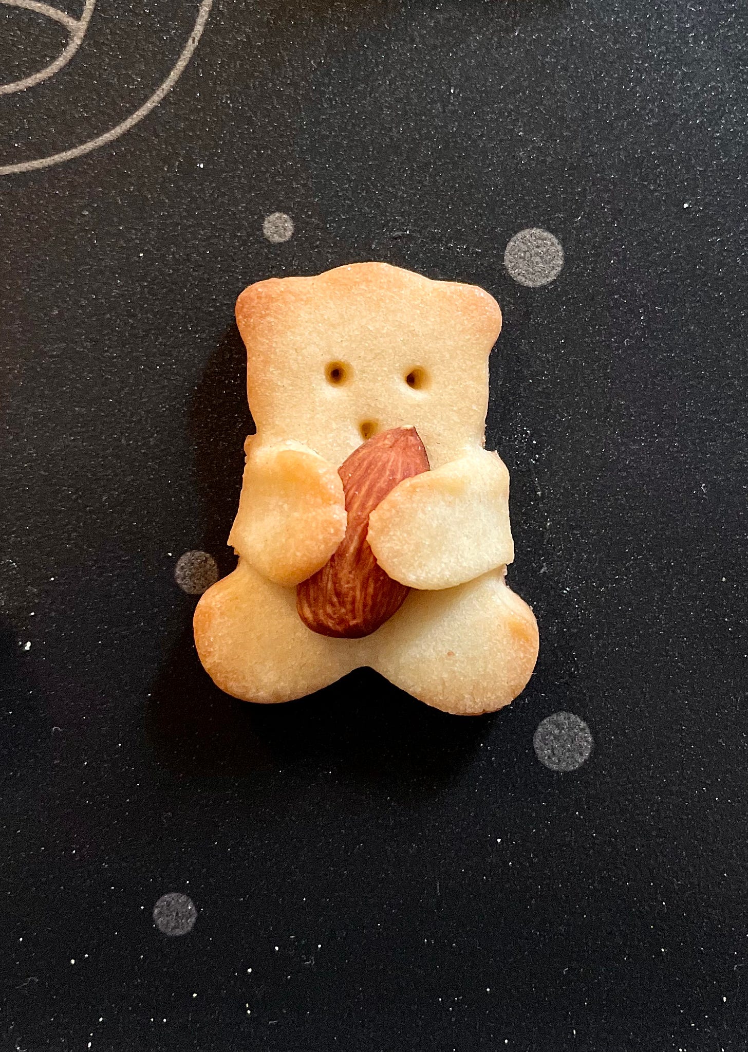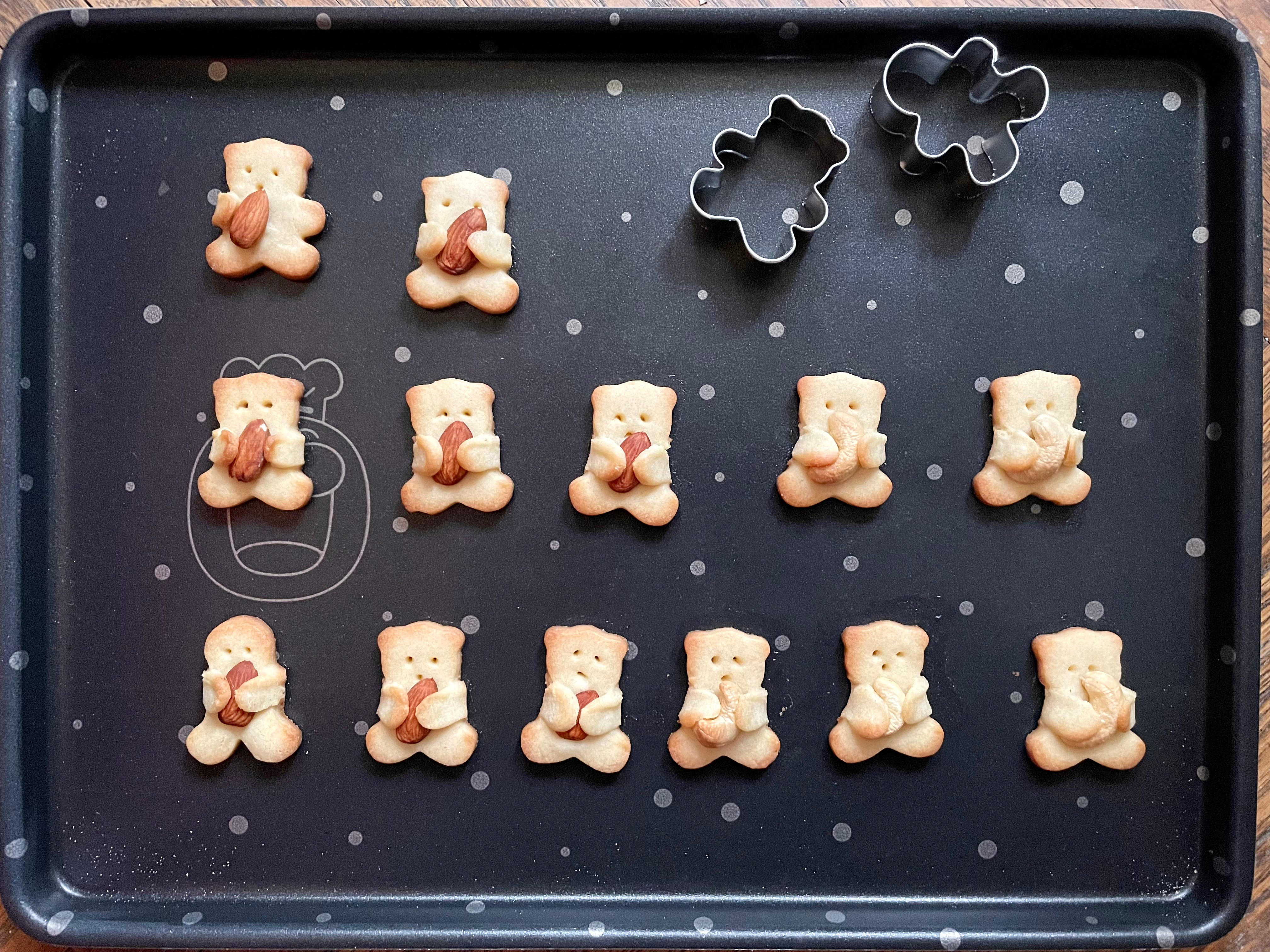 Cu o scobitoare, fă-le ursuleților “ochi“ și “gură“. Pune pe fiecare câte o nucă/alună și adu-le brațele în jurul ei - se vor rupe la “umeri“ dar e ok. Dă tava la cuptor 8 minute sau până când ursuleții sunt rumeniți și gata să-și facă treaba.
