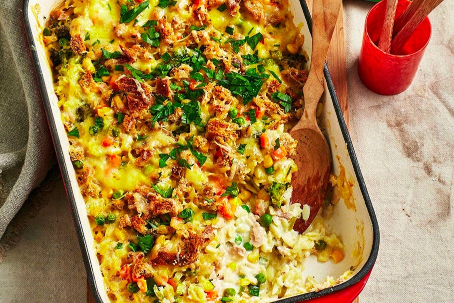 Pune într-un bol mare: pastele, broccoli, sosul, tonul, legumele, jumătate din cașcaval, ceapa și coaja de lămâie. Asezonează și amestecă. Toarnă în tavă. Așază deasupra pâinea și restul de cașcaval. Dă la cuptor 15-20 de minute. Decorează cu pătrunjel când s-a răcit puțin.