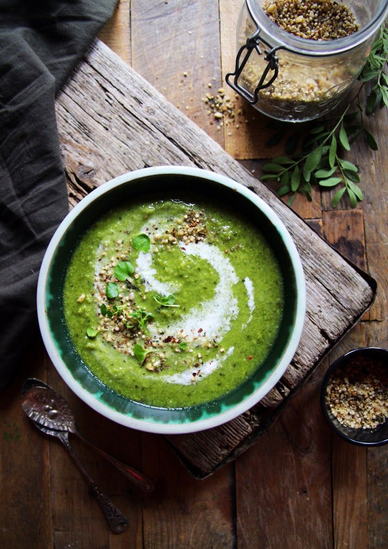 Încinge 2 linguri de ulei într-o cratiță și călește cepele cam 5 minute. Adaugă usturoiul și dovlecelul și mai călește 2 minute. Pune legumele deshidratate și apa și dă în clocot. Adaugă mazărea și spanacul. Când a dat în clocot din nou și spanacul s-a înmuiat, ia de pe foc. Adaugă mentă, 1/2lgt de sare și 1/4 lgt piper. Dă prin blender până când ai o supă fină. Poți să mai adaugi apă fierbinte dacă e un amestec prea gros.