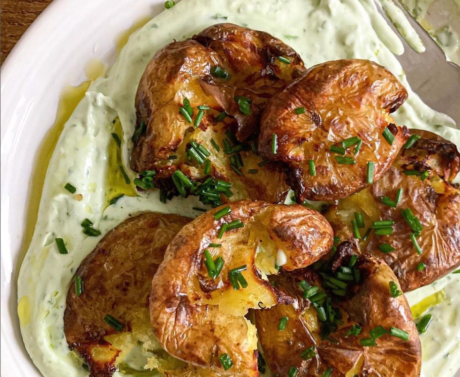 Cartofi caramelizați cu sos de iaurt și verdețuri [V] [PLITĂ] [CUPTOR] [40 minute] [4P]