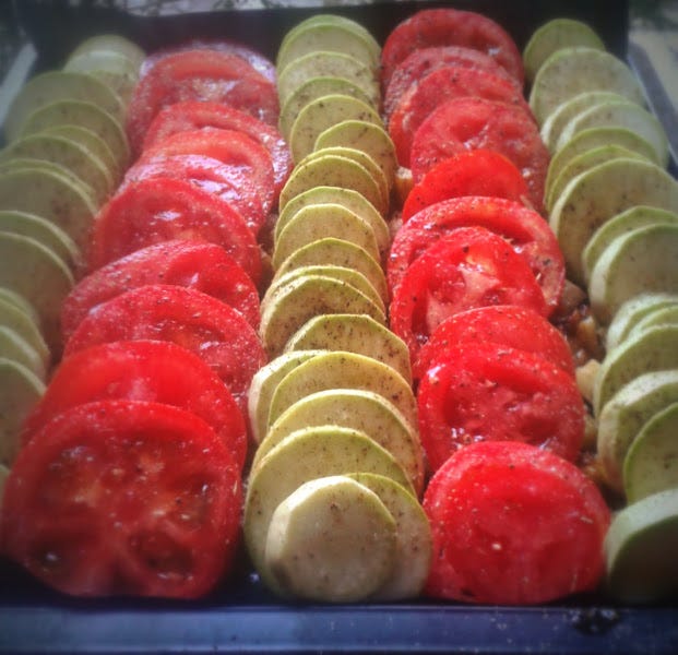 Când ceapa și usturoiul au devenit translucide, adaugă vinetele și călește până s-au rumenit. Pune tot amestecul în tavă și aranjează deasupra, alternativ sau în șiruri separate, feliile de roșii și de dovlecei. Asezonează cu sare și piper, pune ierburile de Provence și stropește cu celelalte 3 linguri de ulei de măsline.