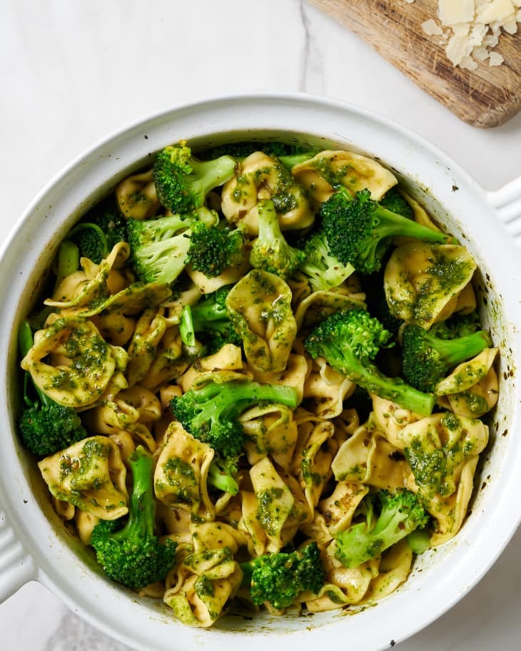 Dă în clocot o cratiță cu apă sărată și opărește broccoli cam 2 minute, apoi scoate-l. Pune tortellini și fierbe-i cât scrie pe ambalaj. Oprește 1/2 cană de apă de la paste și scurge restul. Pune înapoi pe foc cu apa păstrată și pestoul. Amestecă să ajungă sosul pe toate pastele. Adaugă broccoli, amestecă și ia de pe foc. Pune parmezan ras, sare, piper și puțin ulei de măsline extravirgin.