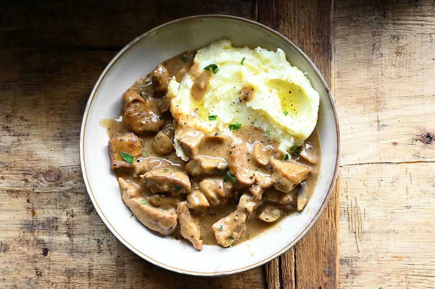 Gătim seara: Tocană simplă de porc și ciuperci, piure