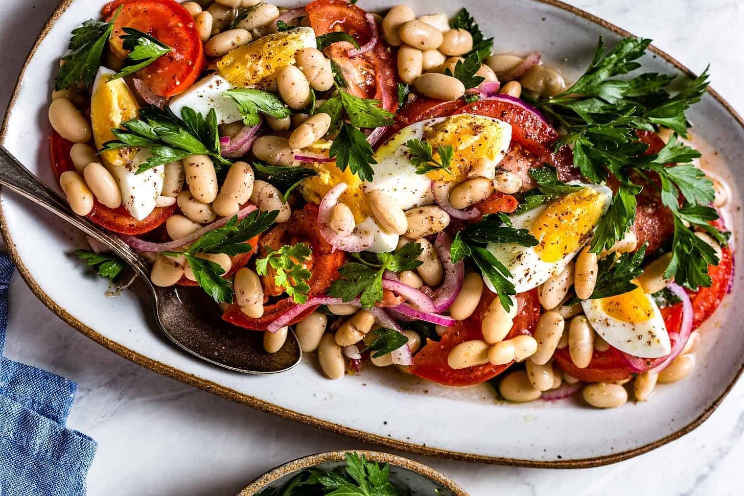 Scurge și spală 2 conserve de fasole albă de 400g. Taie în două 250g de roșii cherry. Taie o jumătate de ceapă roșie în felii subțiri. Pune totul într-un bol cu o mână de frunze de pătrunjel și 1 lingură de sumac. Fă un dressing din: 4 linguri ulei de măsline, 4 linguri de oțet de vin roșu, 2 linguri de zeamă de lămâie, 1 cățel de usturoi ras, sare și piper și toarnă-l peste salată. Mănâncă cu ouă fierte (vezi mai jos).