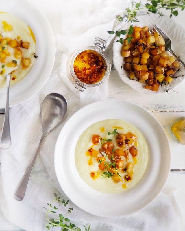 Între timp, toacă mărunt o ceapă galbenă mică și două tije de țelină Apio și călește-le într-o cratiță înaltă în puțin ulei, la foc mediu. Adaugă 5 păstârnaci tăiați rondele și 2 cartofi mari tăiați cuburi, apoi acoperă totul cu stock de legume. Pune capacul și fierbe până când legumele s-au gătit. Pasează cu blenderul și mai adaugă stock fierbinte dacă ai nevoie să reglezi consistența. La final, asezonează cu sare și piper. Mănâncă cu câteva crutoane de păstârnac presărate pe supă.