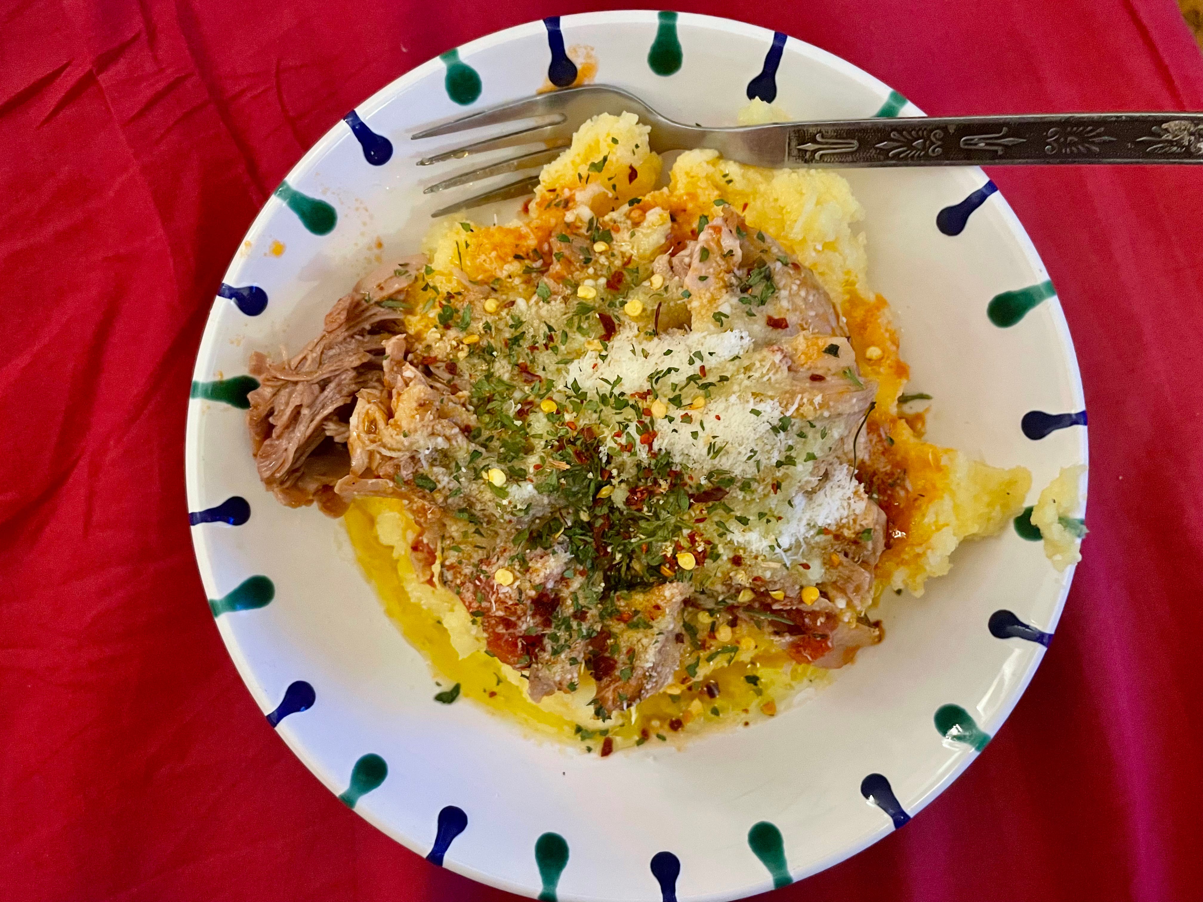Mănâncă cu piure (eu am mâncat cu mămăligă, poți face și asta), cu pătrunjel uscat și fulgi de chili deasupra, plus o lingură de parmezan ras.