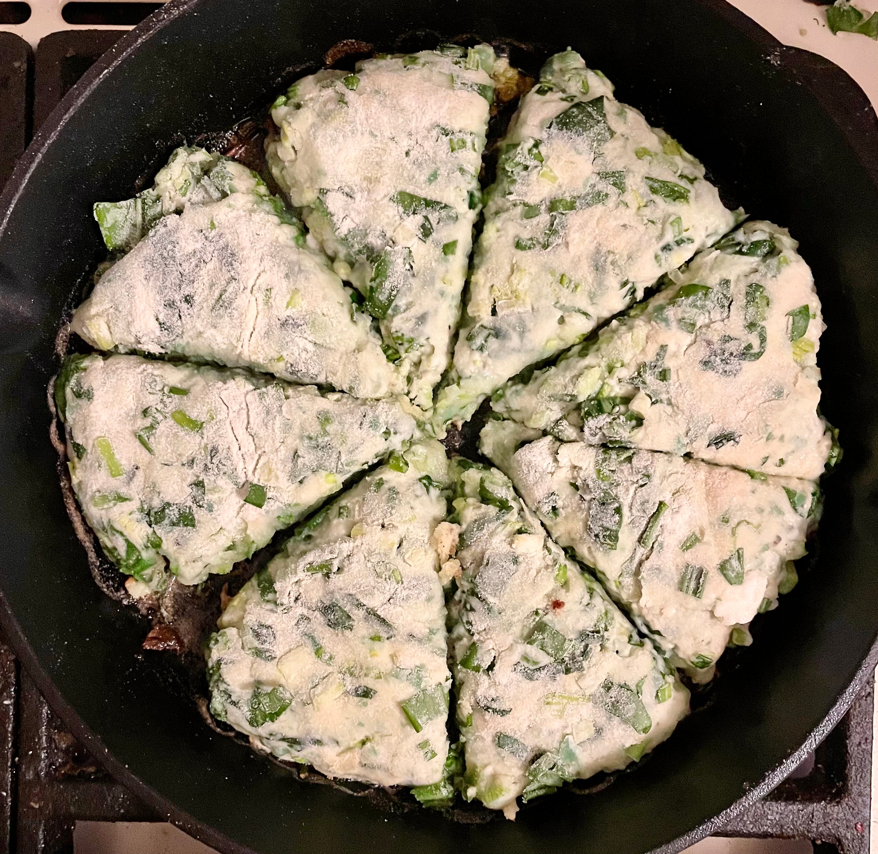 Într-un bol sau în bolul mixerului, pune 300g de făină, 150ml de lapte cald, un ou mare, 1 linguriță de praf de copt, 50g de cașcaval, 50g telemea fărâmițată, 100g de leurdă spălată bine și tocată mărunt și 1/2 linguriță de sare. Amestecă și frământă puțin să ai un aluat omogen. Împarte aluatul în 2, fă din fiecare bucată un disc plat cu grosimea de 1 centimetru și taie-l în 8 bucăți, ca pe o pizza. Încinge o lingură de ulei într-o tigaie și prăjește triunghiurile pe ambele părți, până devin aurii. Rețetă tradițională bulgărească, adaptată din Ierburi uitate, cartea de rețete de foraging a Monei Petre.