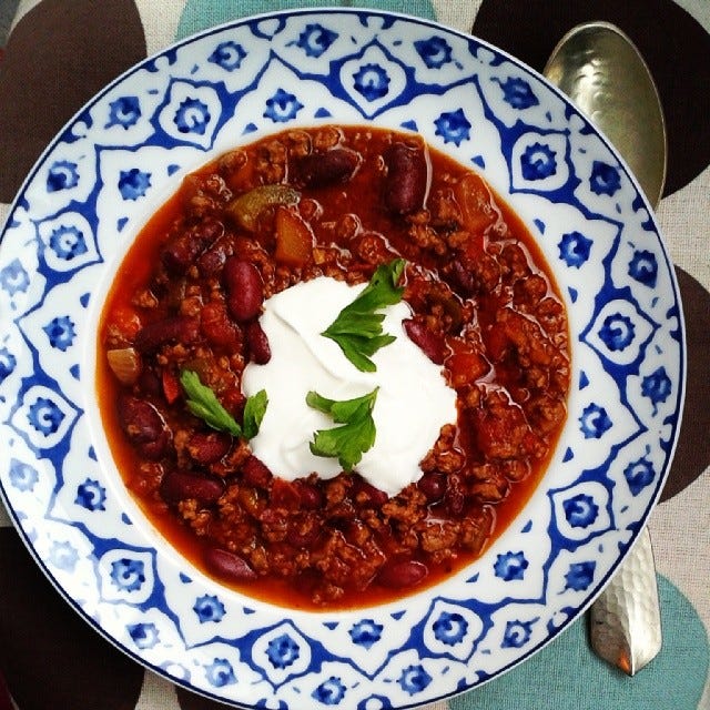 Chili e mai bun a doua zi după ce a fost gătit. Când mănânci, pune deasupra o lingură de iaurt grecesc și câteva frunze de pătrunjel/coriandru.