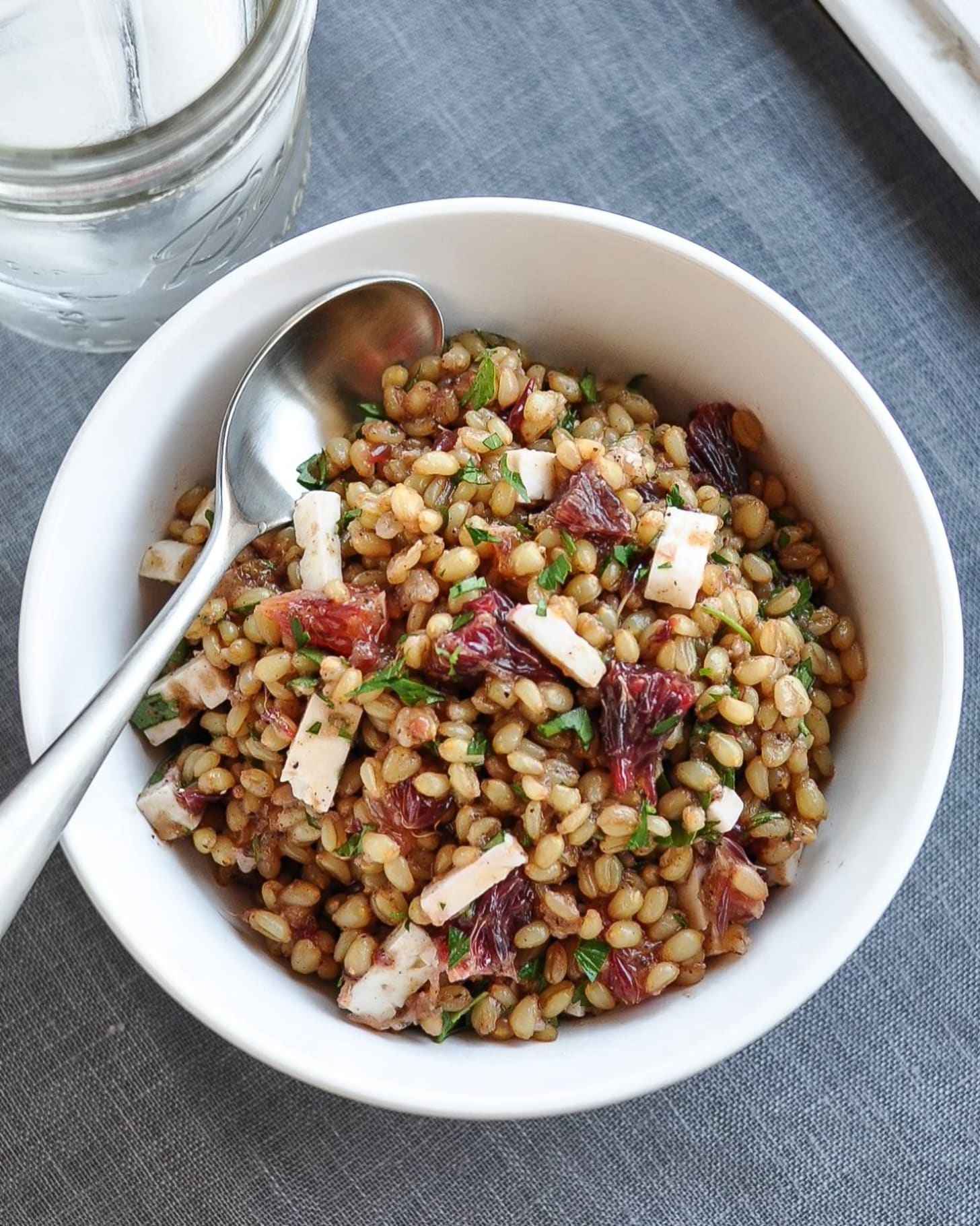 Dă în clocot 1L de apă sărată și pune în ea 1 cană de arpacaș spălat; fierbe la foc mic cam 25-30 de minute, până grâul e gătit; între timp, curăță de coajă 2 portocale roșii sau alte citrice care îți plac și taie cuburi cam 100g de telemea de vacă sau de feta; când grâul e fiert, scurge-l și amestecă-l cu 6 linguri de vinegretă (vezi mai jos), feliile de portocală și bucățile de brânză, plus o mână de pătrunjel tocat - notă: poți folosi orice grână: hrișcă, orz, mei - adaptat de aici.