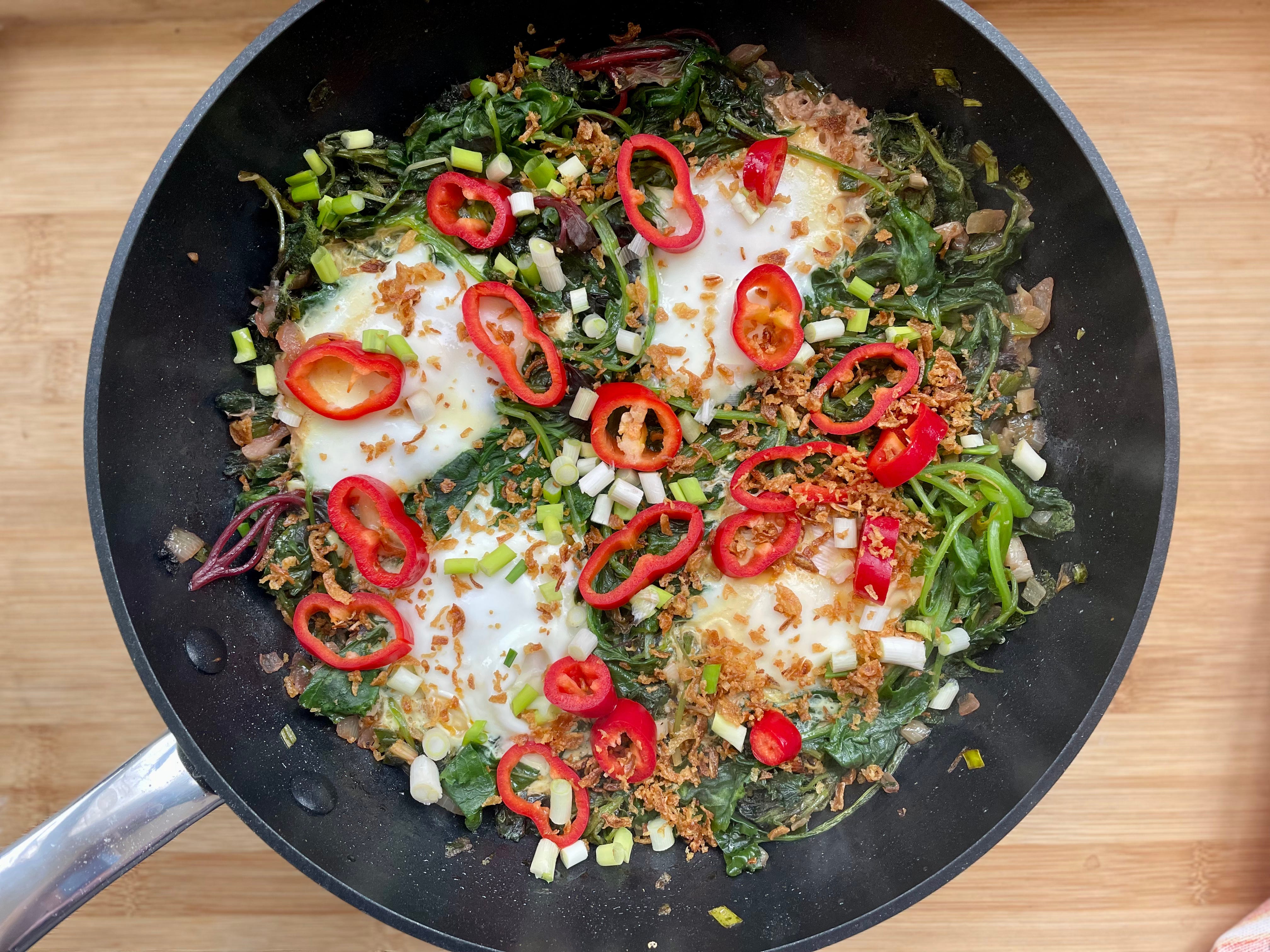 Pune un capac și fierbe înăbușit câteva minute. Apoi fă 4 gropițe în frunze și sparge în fiecare câte un ou. Pune iar capacul și lasă să fiarbă până ouăle sunt albe deasupra. Ia capacul și lasă să mai fiarbă puțin, să se evapore din apa lăsată de verdețuri. Ia de pe foc și decorează cu ardei gras/kapia tăiat rondele, ceapă verde rondele și ceapă prăjită. Mănâncă cu ridichi.