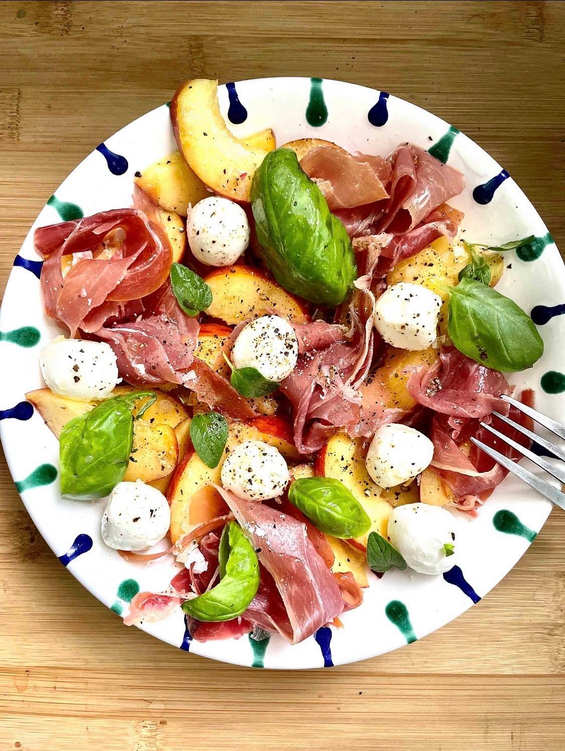 Spală, curăță de sâmburi și tai felii subțiri 4 piersici mari, foarte coapte. Așază-le pe un platou. Pune deasupra cam 200g de burrata/mozzarella/brânză dulce/cottage cheese (ce găsești!), cam 10g de frunze de busuioc și 100g de prosciutto/bresaola/alt mezel italienesc fin. Presară sare și piper și puțin ulei de măsline.