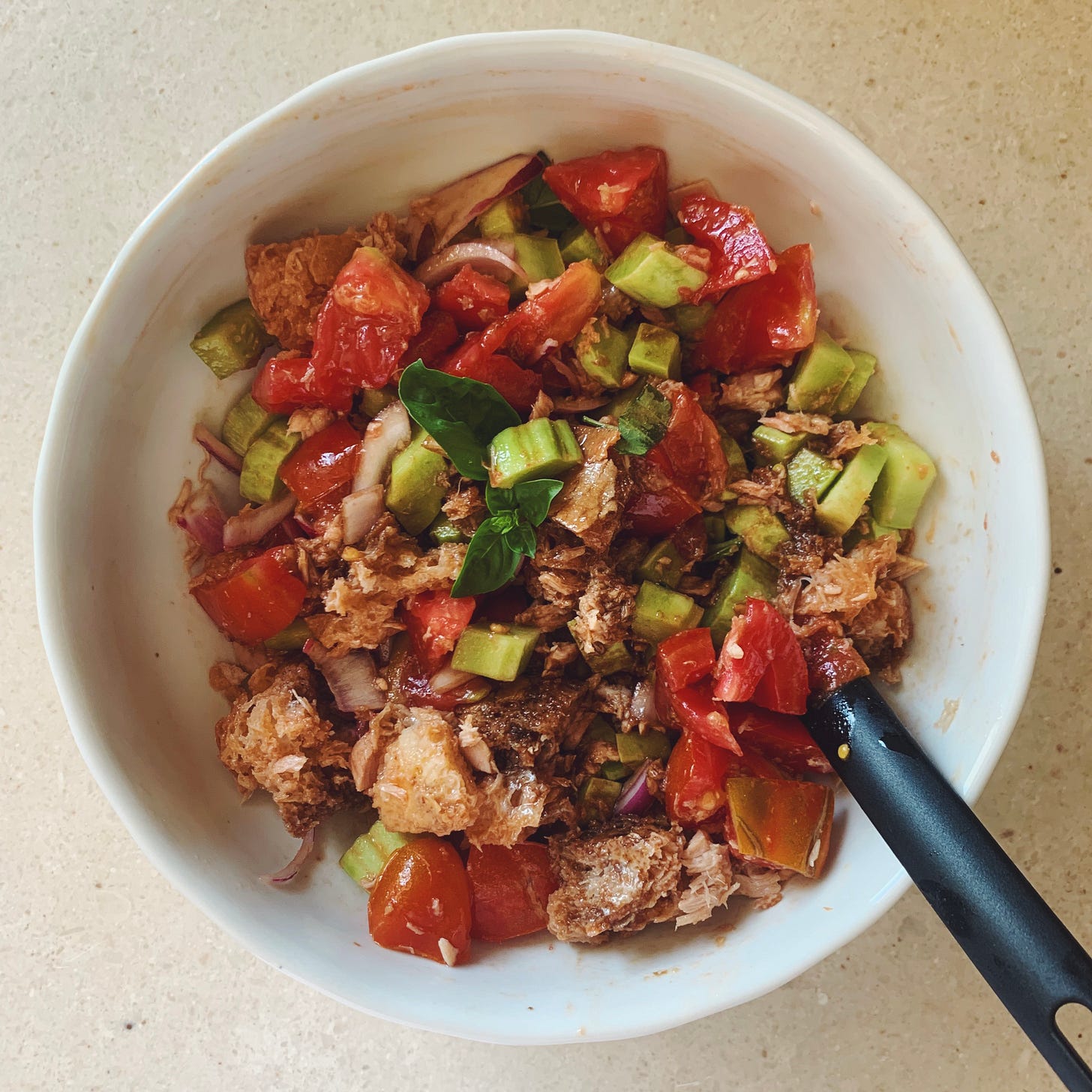 Curăță (sau nu) castravetele și taie-l cubulețe de 1cm. Pune-le peste roșii. Taie roșia felii subțiri și pune-le și pe ele deasupra. Adaugă tonul cu tot cu uleiul din conservă și amestecă totul. Adaugă crutoanele și amestecă din nou.