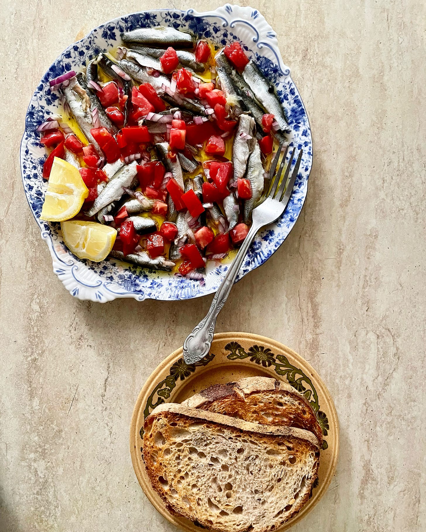 Pune pe o farfurie întinsă: 200g de sardeluțe marinate, o roșie tăiată cubulețe mici, o jumătate de ceapă roșie tăiată cubulețe mici. Stoarce deasupra o lămâie întreagă și picură puțin ulei de măsline extravirgin. Mănâncă cu pâine prăjită.