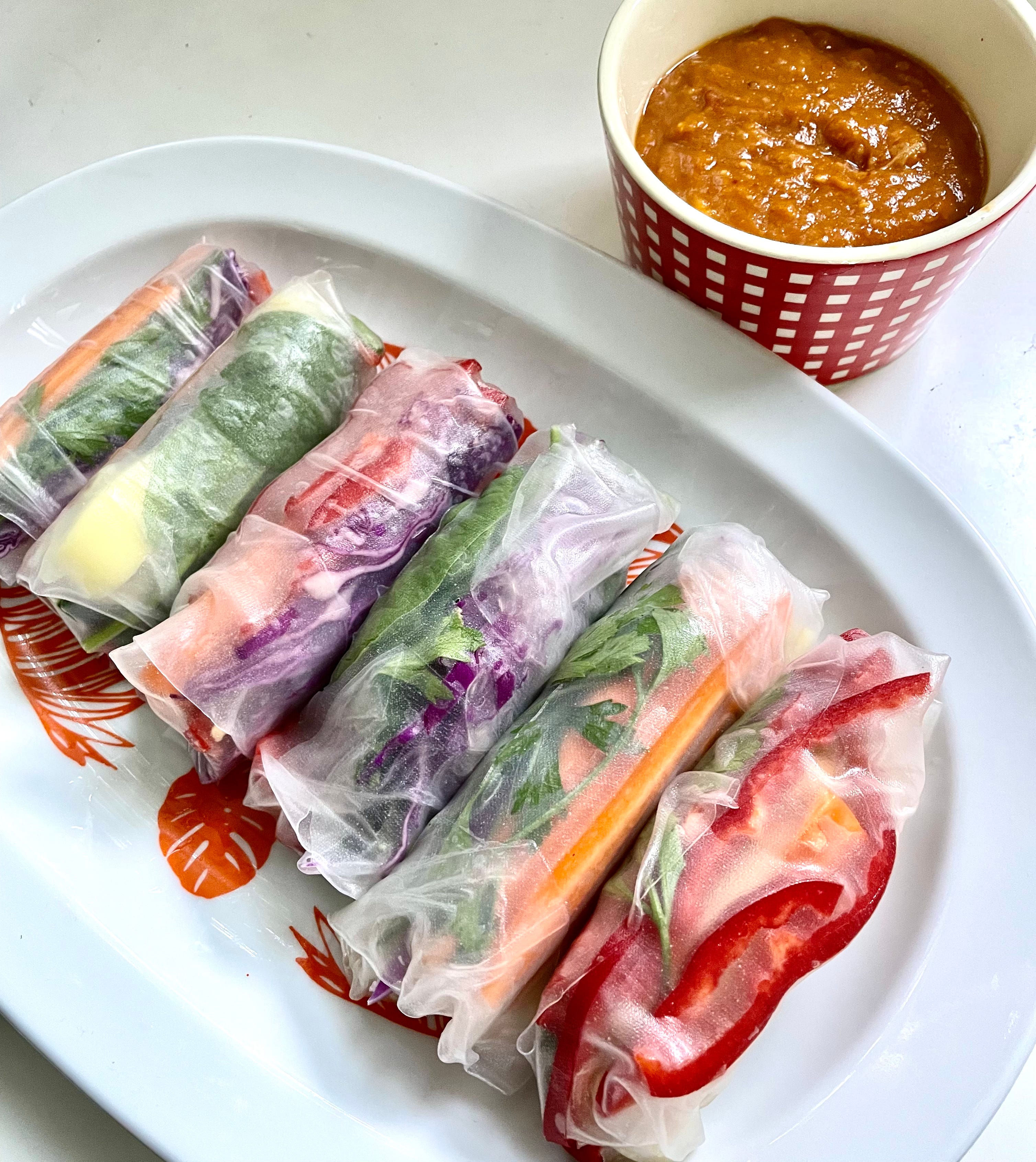 Înmoaie în apă rece câte o foaie de orez și umple-o cu morcov, gulie/varză și ardei kapia tăiate bastonașe, plus niște frunze de pătrunjel. Fă 3 sau 4 de persoană. Într-un bol, amestecă 3-4 linguri de unt de arahide, ghimbir proaspăt ras, 1 lingură de sos de soia, una de miere, puțină pastă de ardei iute sau fulgi de ardei iute și zeama de la 2 limete. Pune sosul pe pachețele sau pachețelele în sos, cum dorești. Se mănâncă pe loc, că foile de orez se usucă - instrucțiuni mai detaliate aici)
