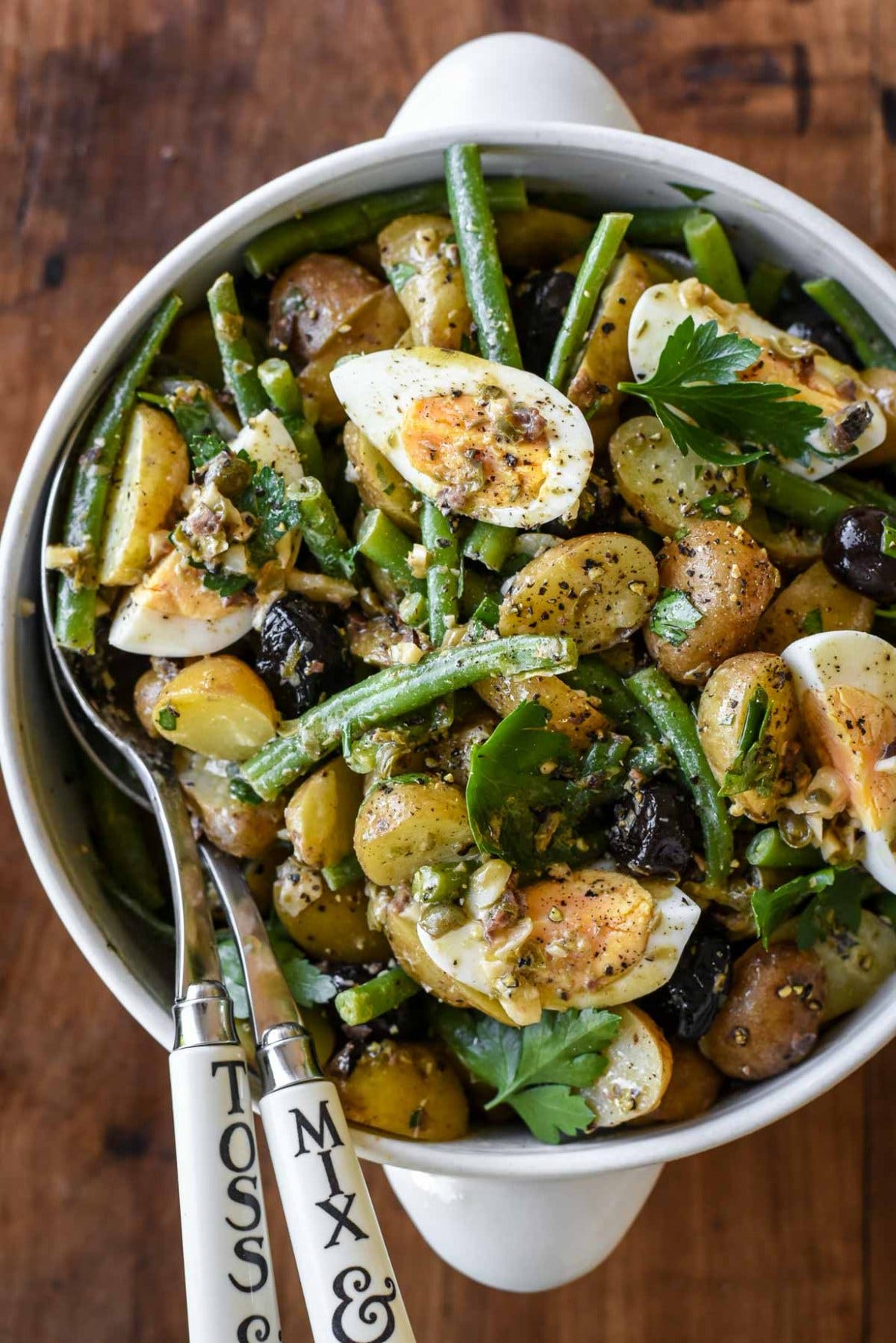 Într-un bol, pune ierburile și amestecă-le cu aproximativ jumătate din vinegretă. Adaugă cartofii fierți, fasolea verde și măslinele întregi, apoi amestecă bine. Așază sferturile de ou deasupra și stropește cu restul de vinegretă (poți folosi tot sau doar o parte, după gust). Potrivește de sare și piper, dacă este necesar.
