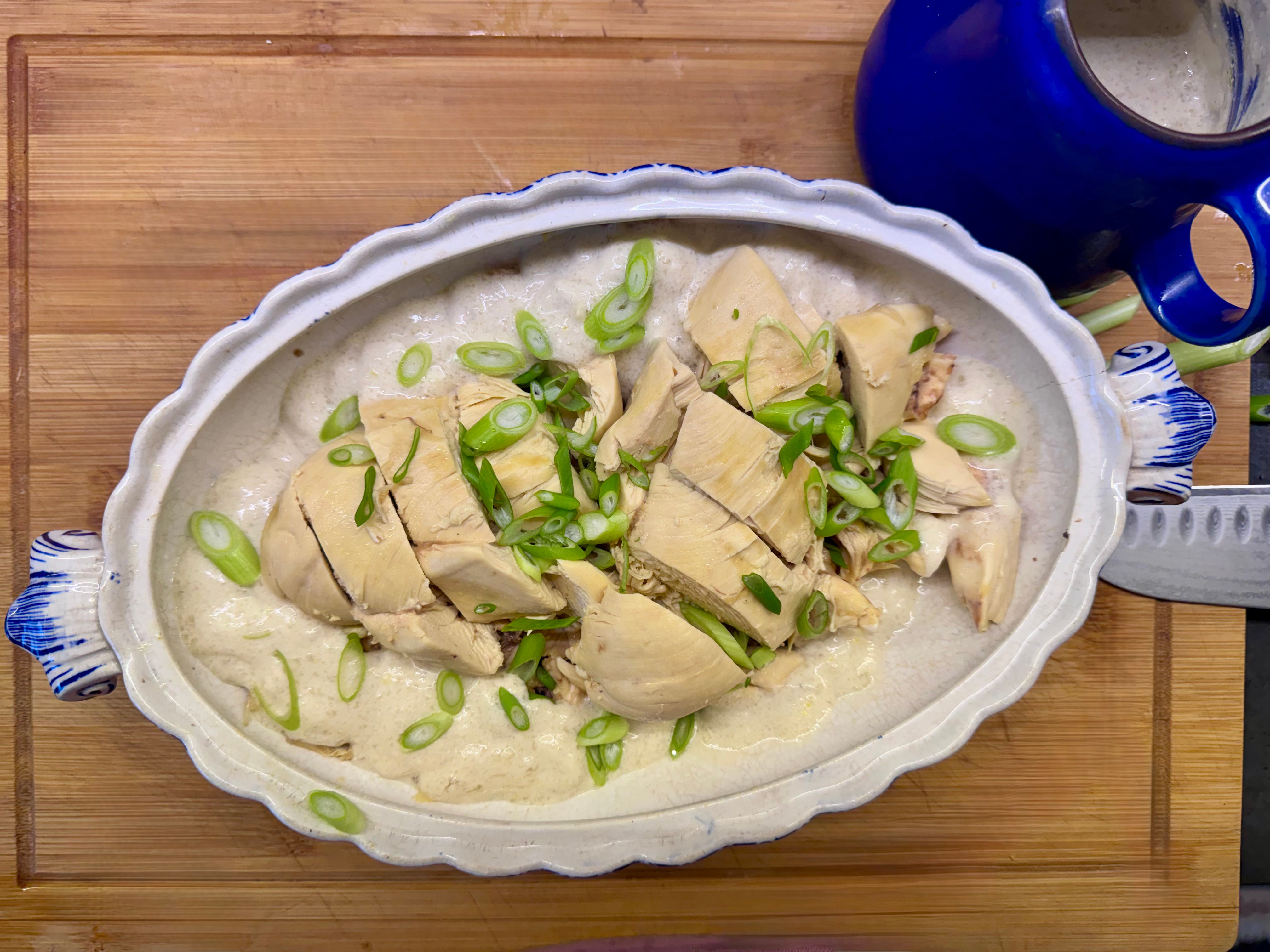 Între timp, curăță puiul de piele (eu o arunc, nu pot mânca piele fiartă, dar dacă îți place, las-o acolo) și dezosează-l complet. Taie-l frumos și toarnă sosul peste el. Decorează cu verdeața pe care o ai la dispoziție.