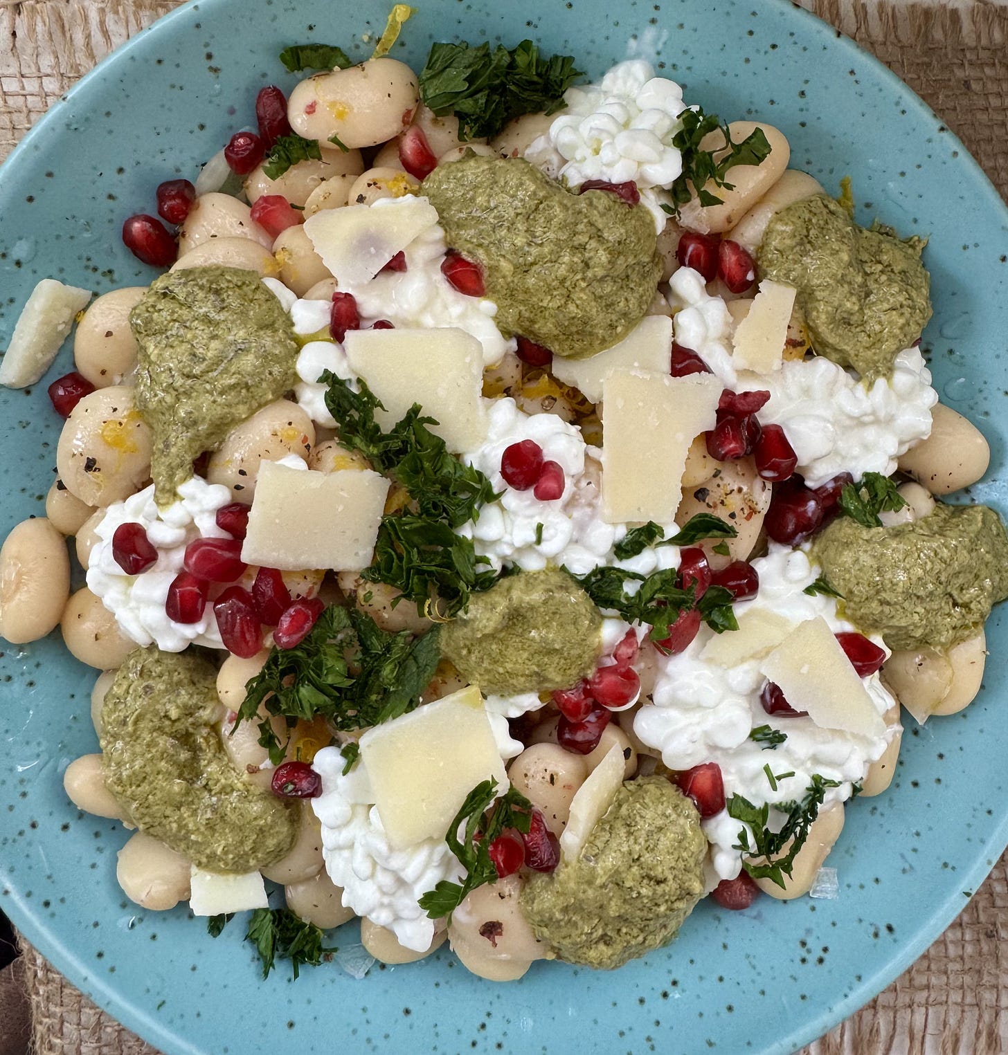 Pune fasolea cu tot cu lichidul din conservă într-o cratiță și încălzește-o până când boabele sunt calde. Scurge-le și pune-le pe un platou. Împrăștie deasupra pesto și cottage cheese. Rade și coaja de lămâie și presar-o, apoi stoarce zeama peste tot. Mai pune 2-3 linguri de ulei de măsline bun și puțin piper proaspăt măcinat. Mănâncă cu o felie groasă de pâine. E bună și rece.