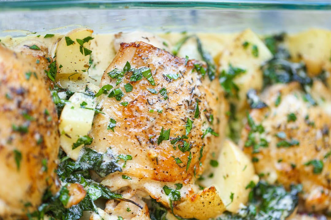 Încinge cuptorul la 170C. Taie cuburi 500g de cartofi și pune-i într-o tavă. Spală și taie mare 200g de spanac baby, pune-l peste cartofi. Crestează 6 pulpe superioare de pui și pune-le peste cartofi și spanac. Într-un bol, amestecă: 2 linguri de ulei, 3 căței de usturoi rași, 250ml de smântână de gătit, 250ml de stock de legume, 50g parmezan ras, 1 linguriță de sare, 1/2 linguriță de piper. Toarnă peste tot ce e în tavă și dă la cuptor cam 1 oră, până când puiul și cartofii sunt rumeniți.