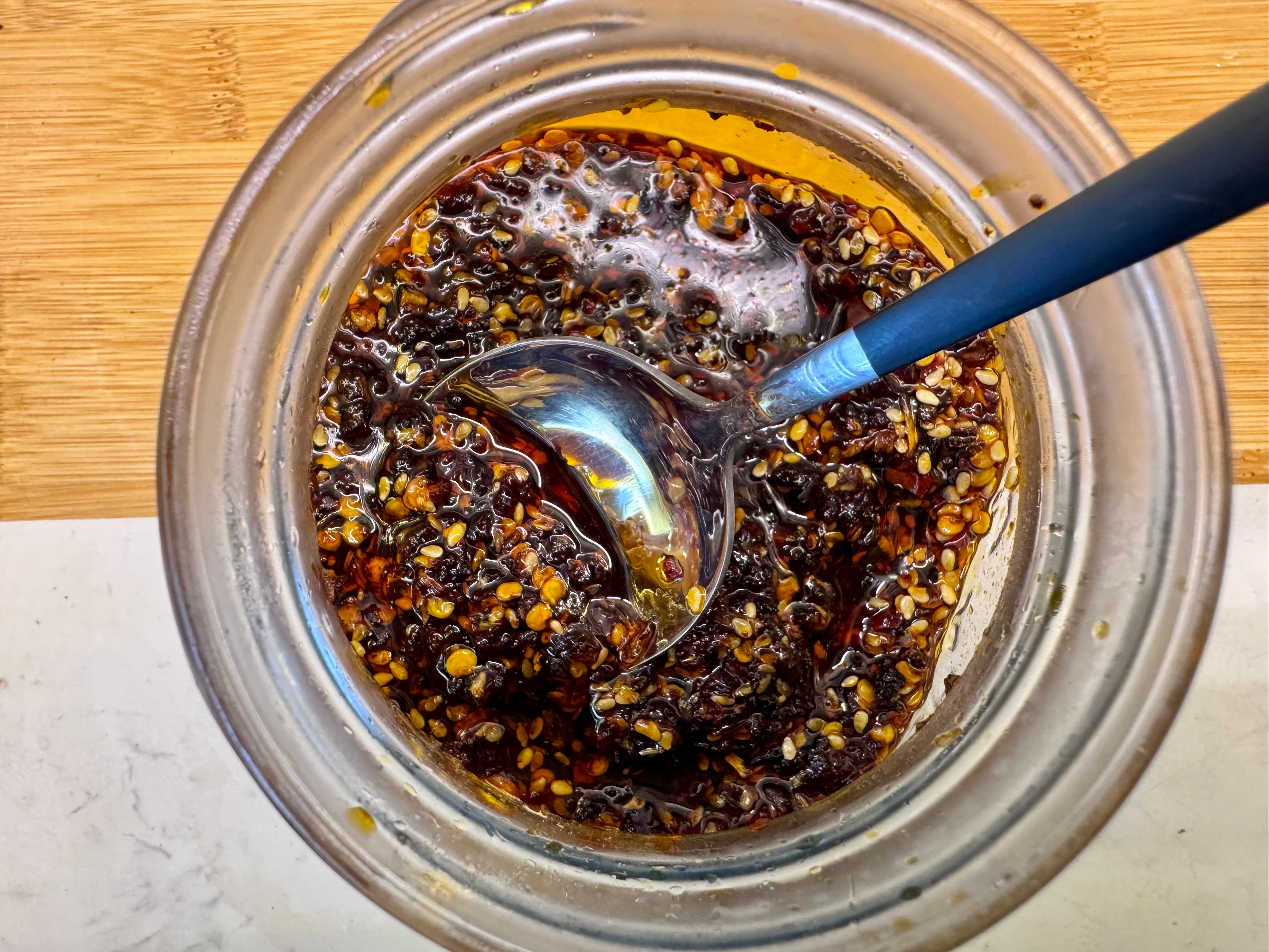 Între timp, amestecă toate ingredientele în afară de zahăr și sos de soia într-un bol (sau un borcan de sticlă borosilicată, să reziste la uleiul fierbinte). Când piperul începe să-și schimbe culoarea, ia uleiul de pe foc și strecoară-l direct peste ingredientele uscate. Lasă să se gătească toate în uleiul fierbinte și, când s-a mai răcit, pune zahărul și sosul de soia și amestecă. Pune la frigider în borcan etanș după ce s-a răcit de tot.