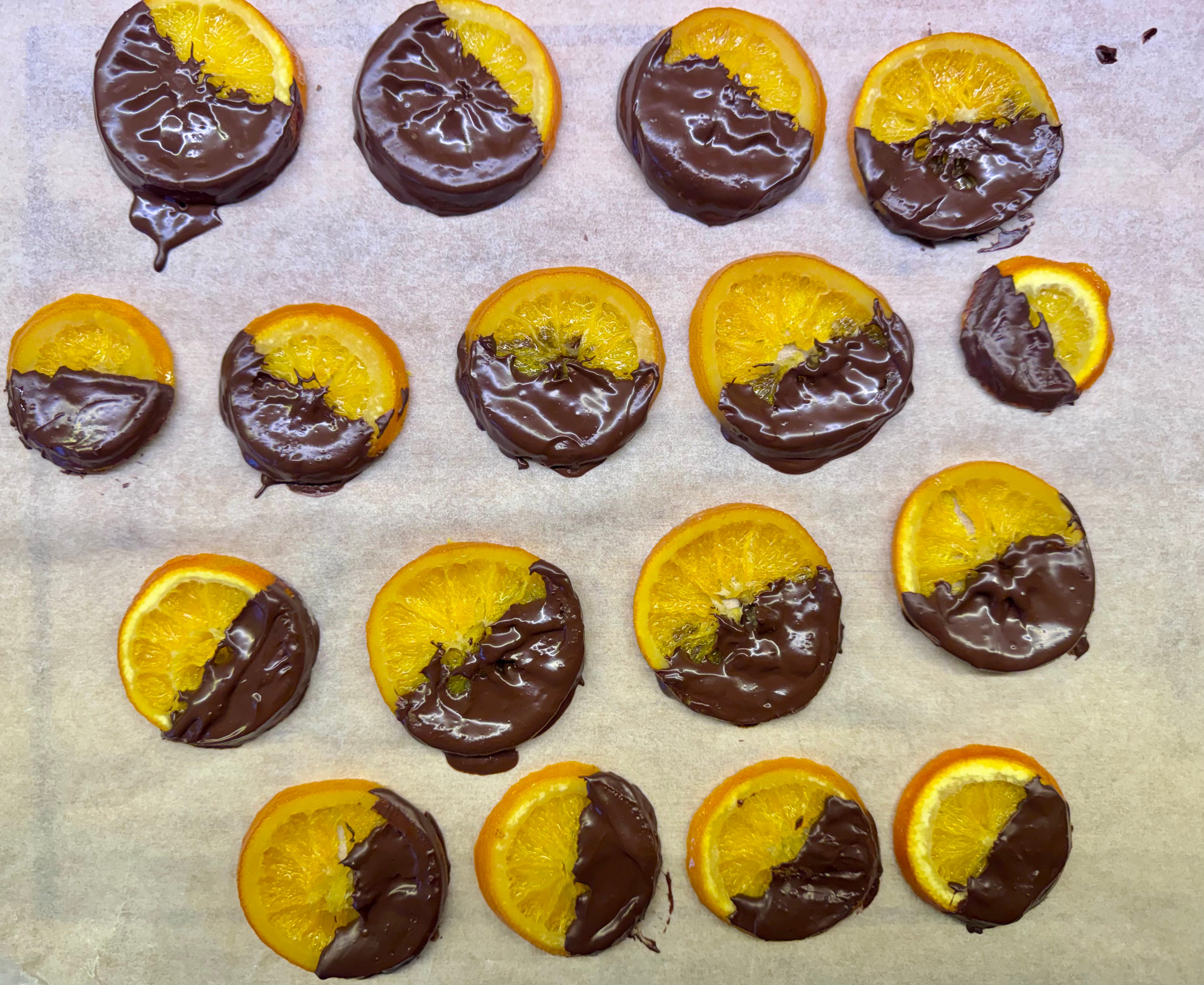 Taie 3 portocale felii de 3mm grosime. Într-un vas larg, pune 400g de zahăr și 400ml apă și fierbe până când s-a dizolvat zahărul, apoi încă 5 minute la foc mic. Pune feliile de portocală într-un singur strat (repeți apoi cu cele rămase) și lasă-le să fiarbă în sirop la foc mic cam 15 minute. Întoarce-le din când în când. Când începe să cedeze pulpa, scoate-le pe un grătar și lasă-le să se usuce peste noapte.