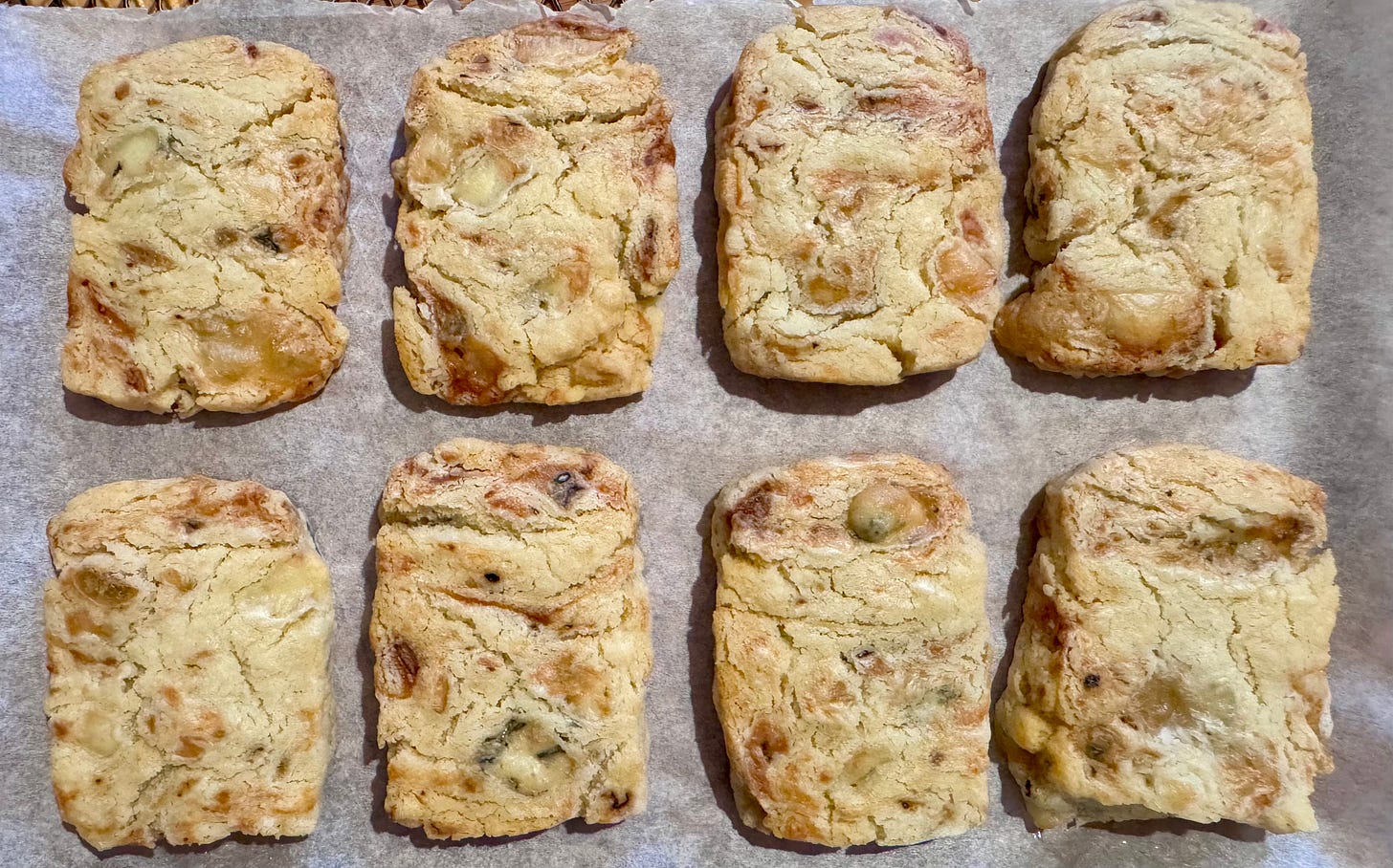 Încinge cuptorul la 175C. Taie aluatul rece în felii de 5mm grosime și dă-l la cuptor până când marginile încep să se rumenească - cam 10-12 minute, dar depinde de cuptor.