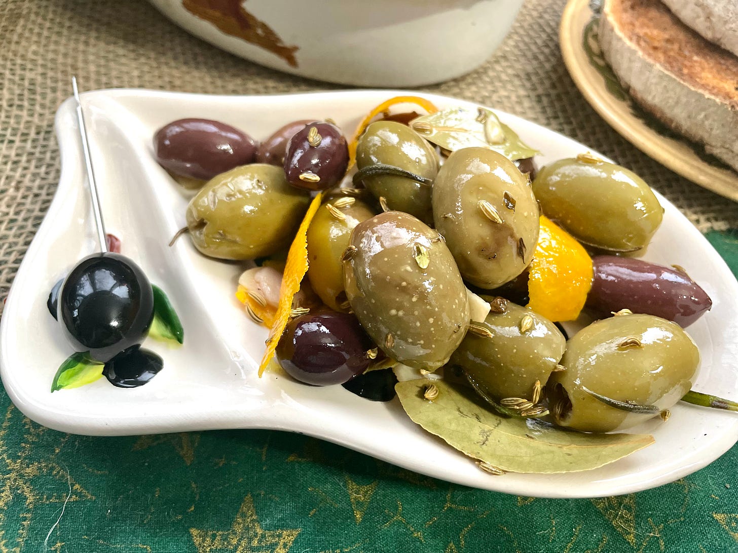 Pune într-o crăticioară uleiul, oțetul, foile de dafin și usturoiul. Încălzește pe foc mic fără să dai în clocot. Ia de pe foc, adăugă restul aromaticelor și toarnă peste măsline (nu trebuie să fie acoperite de sos, doar să stea în același recipient cu el), acoperă și dă la frigider.