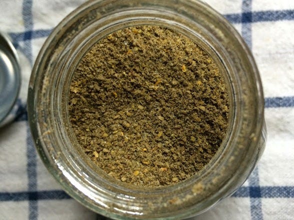 Zdrobește totul în râșnită sau în blender și apoi depozitează într-un borcan etanș. Merge perfect cu carne de porc.
