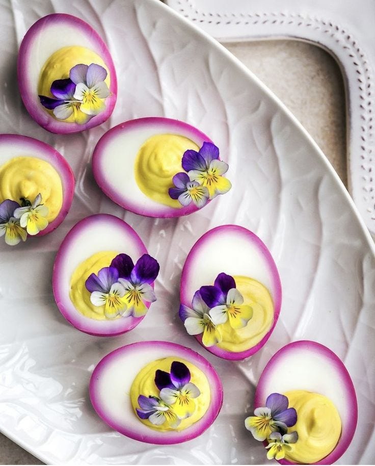 Pune gălbenușurile în blender cu restul de ingrediente și procesează până ai o pastă fină. Umple un poș/pungă cu mixul și împarte-l între albușuri. Decorează cu flori comestibile. Dă la rece până mănânci.