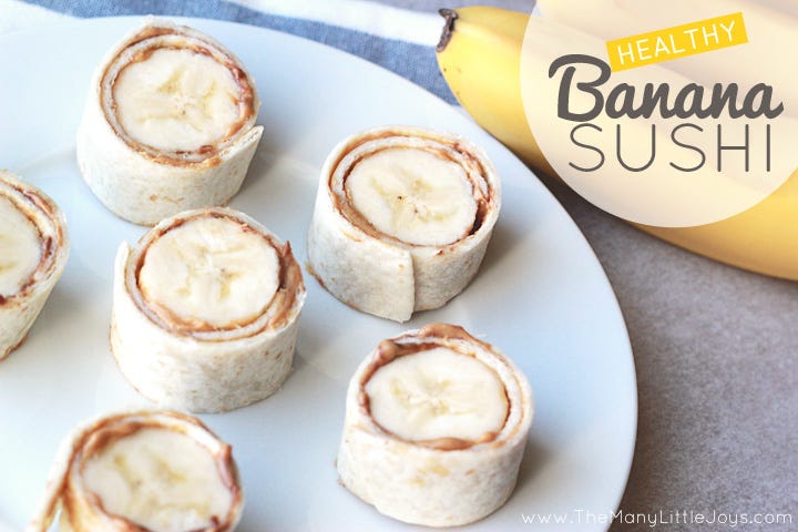 Unge o lipie/clătită/tortilla cu unt de arahide/migdale peste tot. În mijloc întinde și o linguriță de cremă de ciocolată. Pune o banană deasupra, rulează și taie rondele. Sushi!