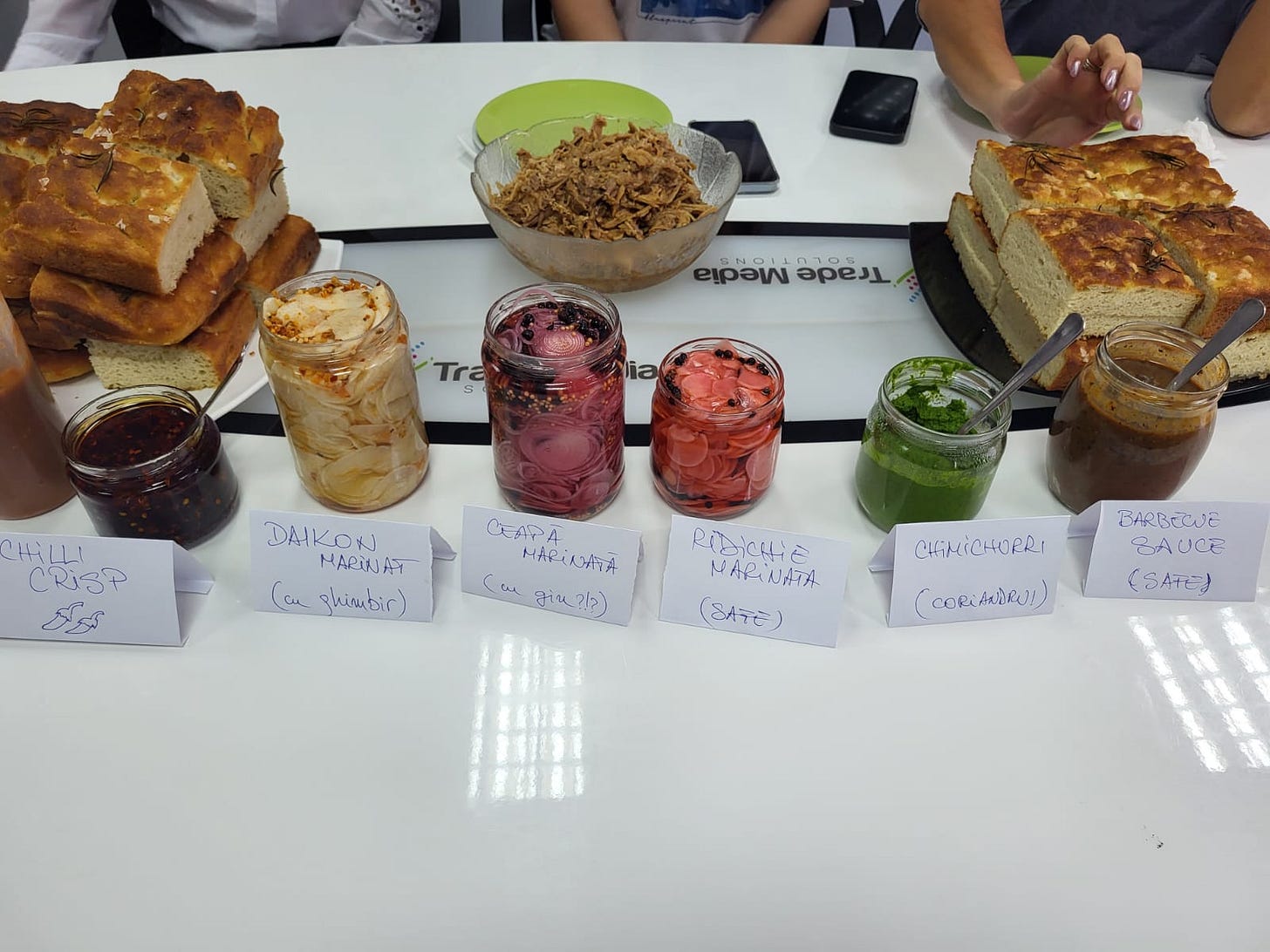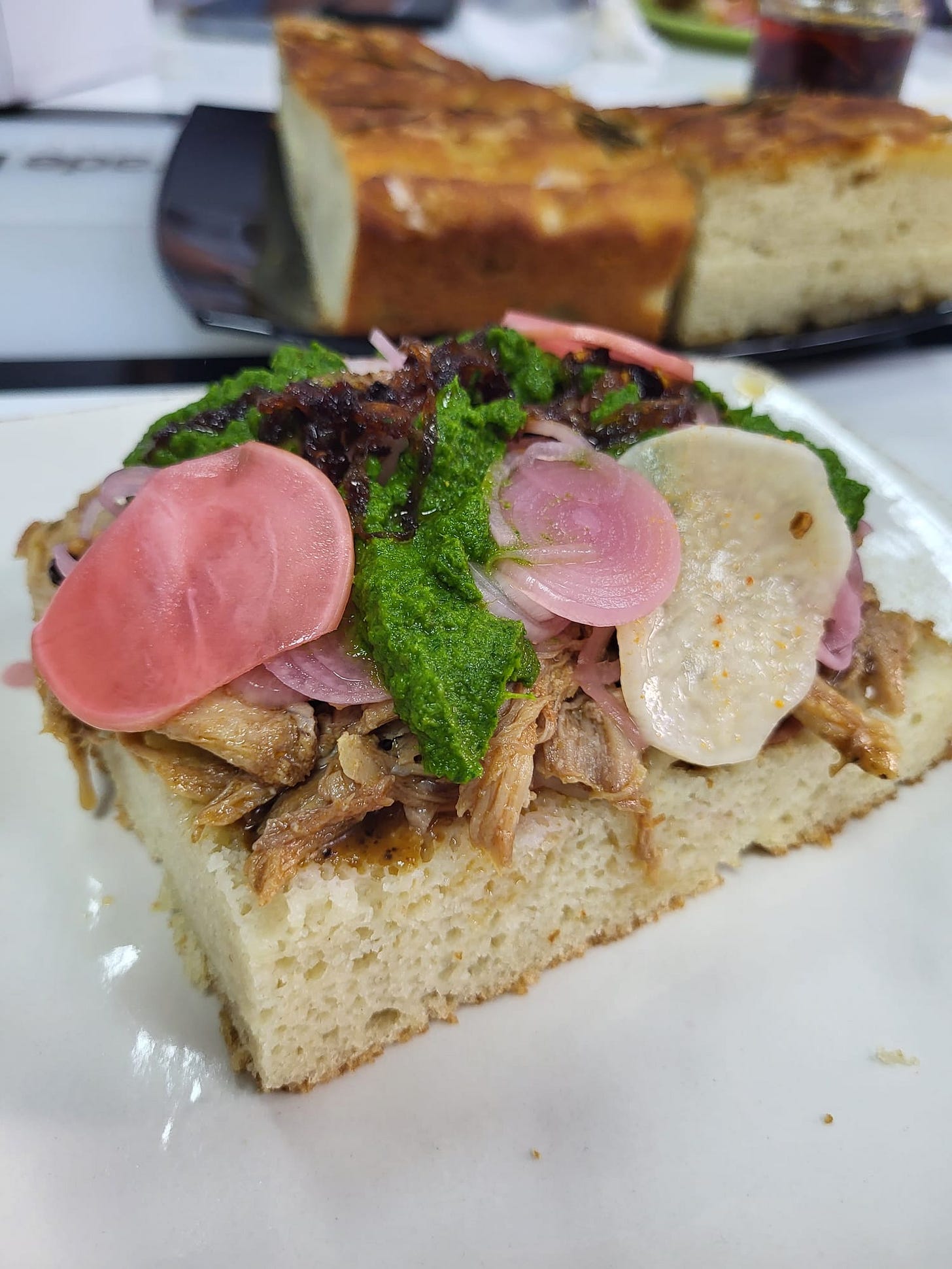 Ediția aceasta e puțin diferită. Azi e ziua mea și vă împărtășesc meniul pe care l-am făcut pentru colegii de birou. Ne place să mâncăm bine - suntem mai multe echipe care scriu reviste despre mâncare, în principal, așa că nu e de mirare - și aceasta e a doua zi de naștere pe care o petrec cu ei. Meniul, însă, e cam la fel ca anul trecut: pulled pork cu diferite condimente și, la desert, tort Amandină. Plus, pentru că eu mănânc fără gluten zilele astea, o prăjitură cu făină de migdale. De altfel, fac o combinație de pulled pork și amandină de mulți ani de ziua mea. Mi se pare un meniu perfect pentru a satisface gusturi diverse, ușor de transportat, asamblat, personalizat. Anul acesta am adăugat mai multe condimente: nu doar sos barbecue, chimichurri și ceapă marinată, ci și hot sauce, ridichi marinate și chili crisp oil. Și am înlocuit chiflele cu focaccia.